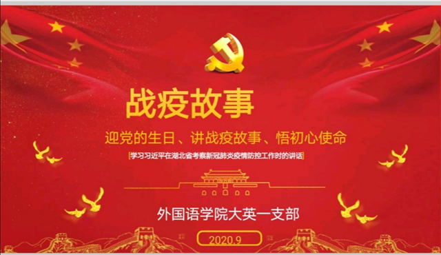 大学英语一党支部分别于9月24日和28日开展了 “迎党的生日、讲战疫故事、悟初心使命”线上学习及集体学习贯彻了“习近平在决战决胜脱贫攻坚座谈会上的讲话”。两次学习由122cc太阳成集团公共外语教学部主任马珂老师主持。大英一党支部全体党员教师参加了学习。