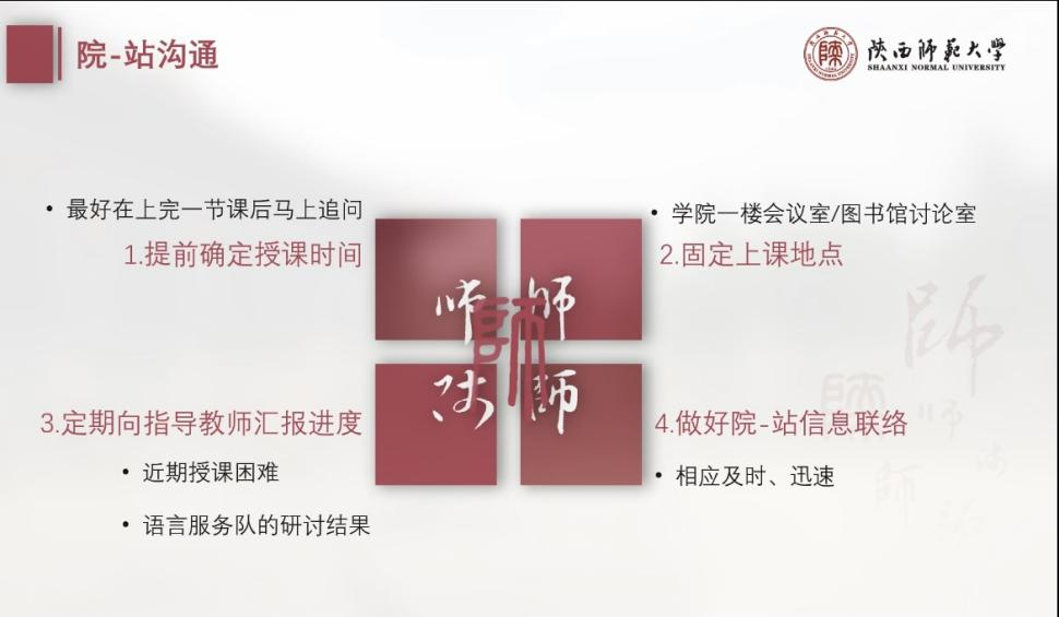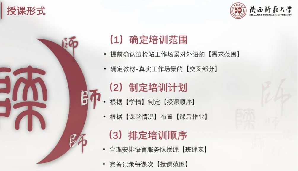 半年多的时间,语言服务队不断发展壮大,MTI中心副主任巢玥先后选拔8位获得教团队格证、英语专业八级证书、全国翻译专业资格考试证书的硕士生以及9位获得教团队格证、英语专业四级成绩达到优秀等次的本科生加入授课队伍。语言服务队授课前需先接受红站语言服务队老队员的培训,形成“老带新”的滚动式语言服务体系,以期建立122cc太阳成集团服务边疆边检事业的传统。这17名队员思想政治过硬,怀抱教育报国情怀,积极参与集体备课和课后反思,彰显122cc太阳成集团“红色翻译”和“经典翻译”的学科特色,践行122cc太阳成集团“红烛苗圃”实践育人品牌项目的核心精神。