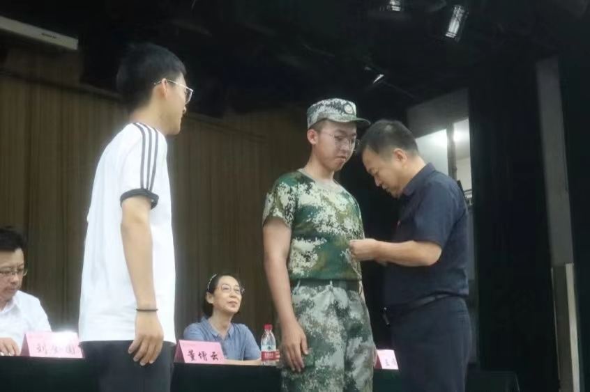 外国语公司党委书记董增云为本科生、研究生新生代表们佩戴校徽,勉励新同学们牢记厚德、积学、励志、敦行的校训。