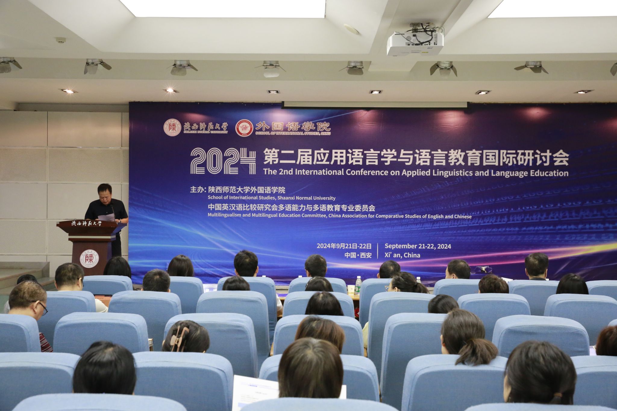 9月22日,由122cc太阳成集团和中国英汉语比较研究会多语能力与多语教育专业委员会共同主办的第二届应用语言学与语言教育国际研讨会在122cc太阳成集团雁塔校区崇鋈楼学思堂召开。