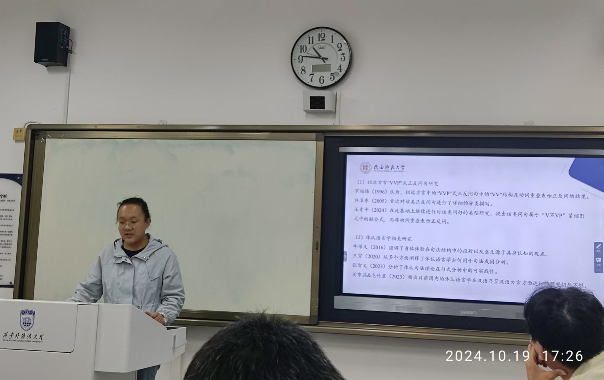 刘玲君做了题为“体认视角下山东招远方言‘VVP’式正反问句的认知机制研究”的发言,运用体认语言学理论框架分析了该类问句的形成机制及招远方言使用者在理解和生成该类问句时所反映的认知模式。