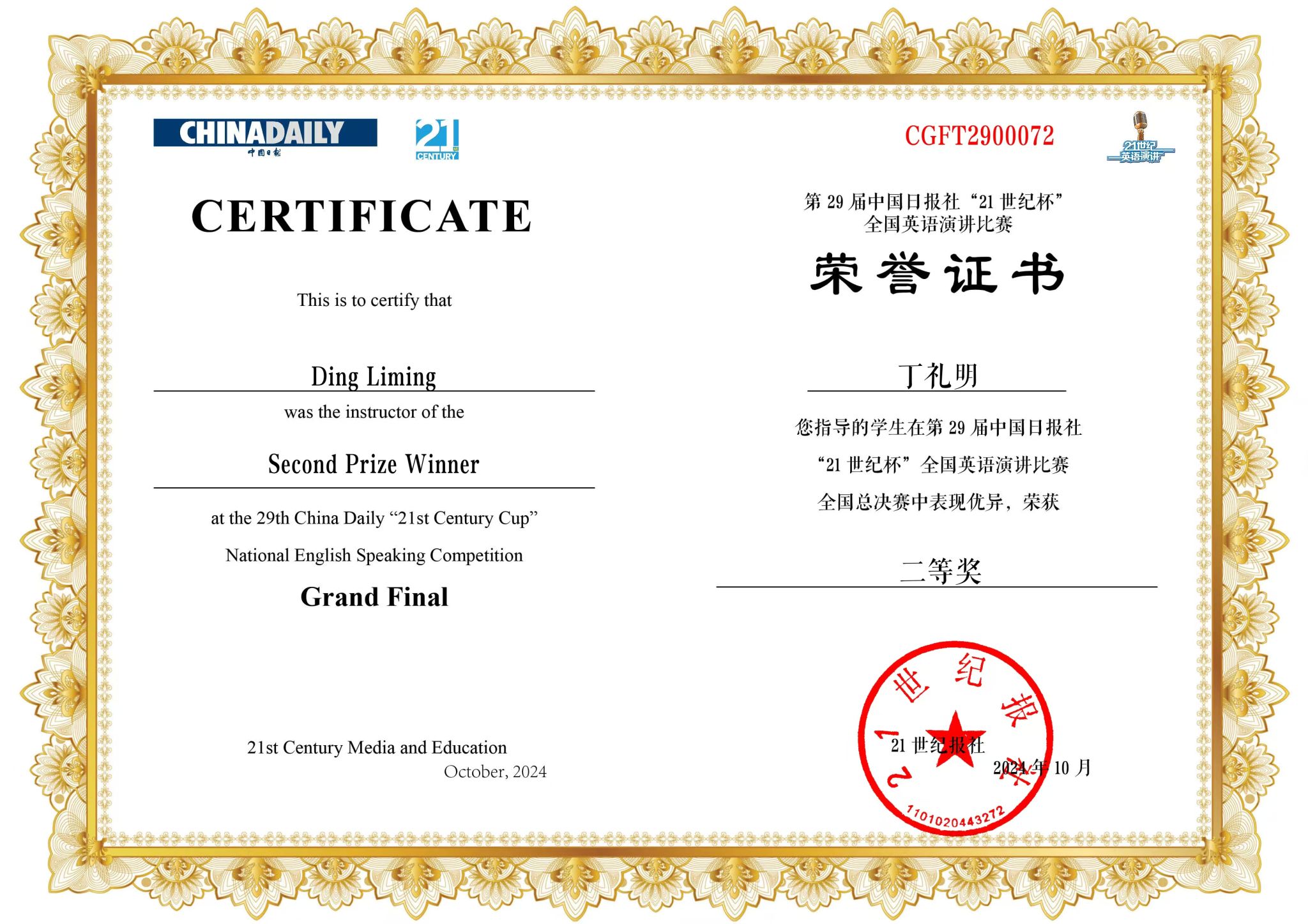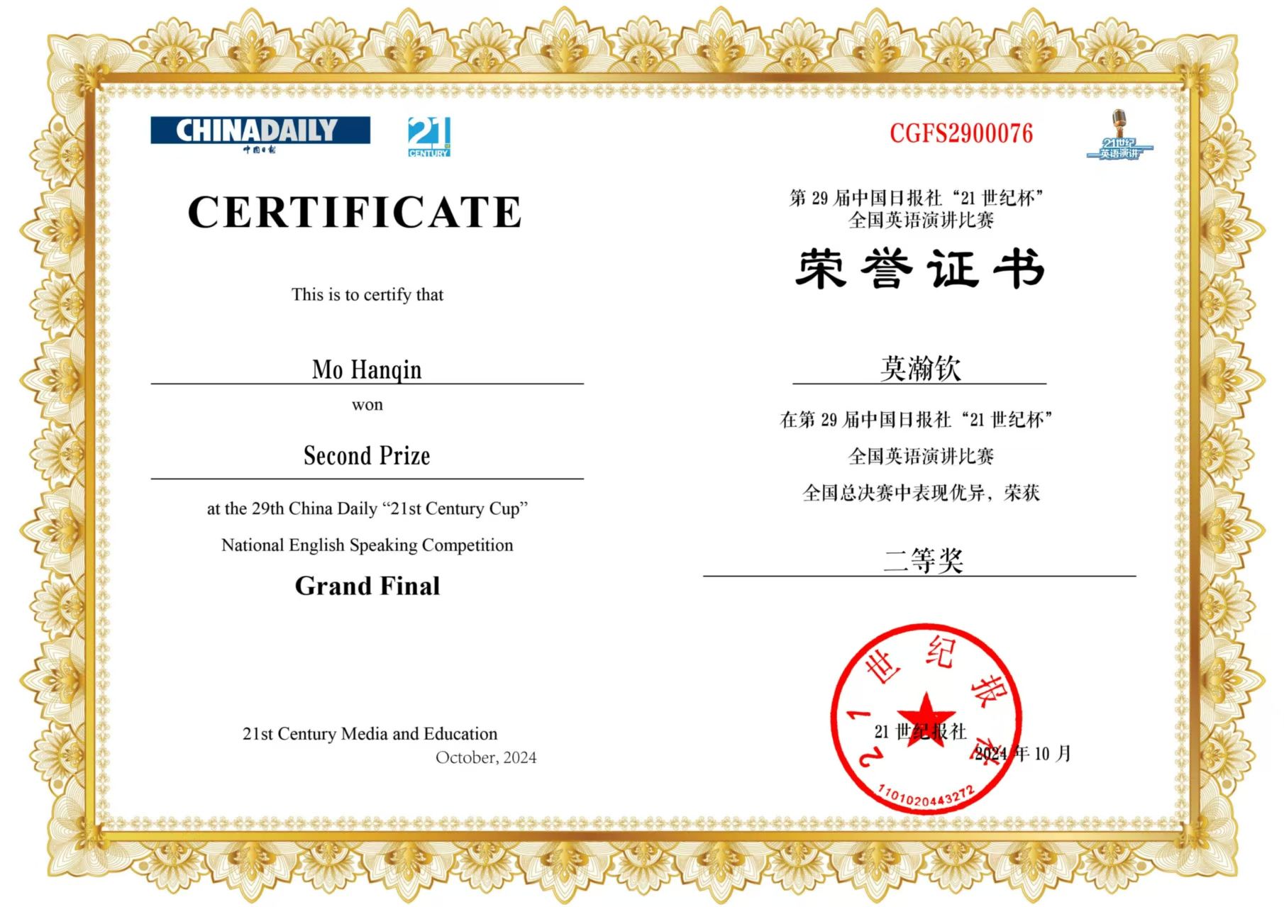 2024年10月17日至10月21日,由中国日报社、21世纪英语教育传媒承办的第29届中国日报社“21世纪杯”全国老员工英语演讲比赛全国赛在江苏无锡落下帷幕。全国总决赛共有来自各个省级赛区的246名选手。在经过5天、三轮的激烈比拼后,122cc太阳成集团英语系2023级英语师范专业莫瀚钦同学获得全国二等奖,122cc太阳成集团英语系丁礼明老师获得优秀指导教师奖。此次获奖也是老员工TOP外语成长训练营的阶段成果。
