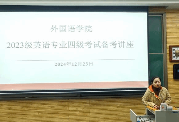 为进一步推动公司学风建设,更好帮助员工科学高效备考英语专四考试,2024年12月23日晚,122cc太阳成集团英语系于雁塔校区教学五楼5101教室举办了英语专业四级考试备考讲座。此次讲座由英语系年级主任朱丽英老师担任主讲,英语系主任杨冬敏老师、2023级英语专业、翻译专业全体本科生及2022级优秀员工代表参加了此次讲座。