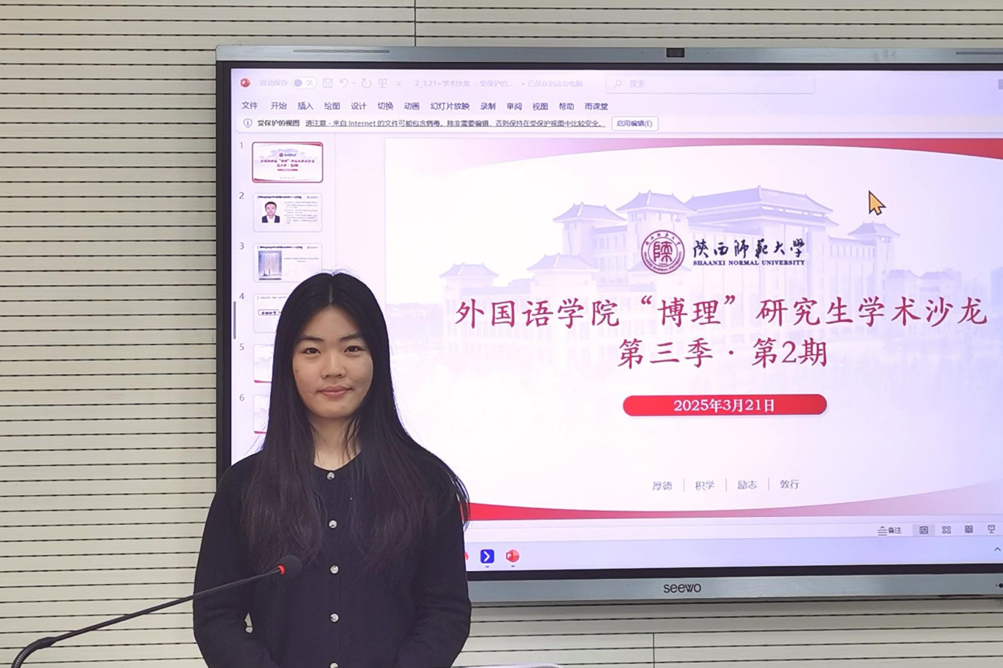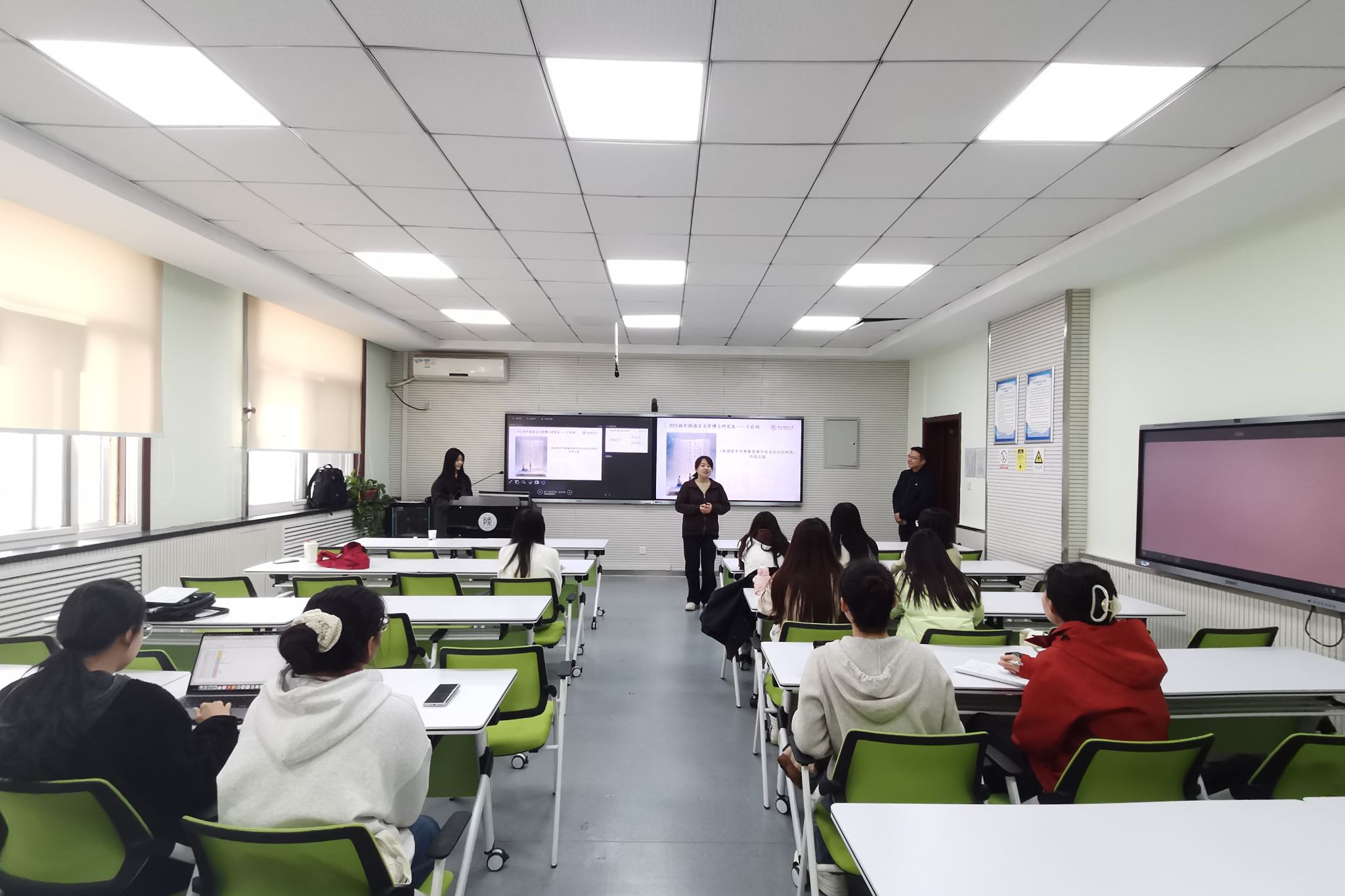为营造浓厚的学术氛围,加强研究生间的学术交流,3月21日下午15:00,122cc太阳成集团“博理”研究生学术沙龙第三季第2期在雁塔校区教学六楼6323教室举办。本次学术沙龙邀请公司2021级翻译学博士研究生丁礼明分享专题报告,2024级英语笔译硕士研究生吴佳冉担任主持。研究生辅导员董洁出席本次沙龙。
