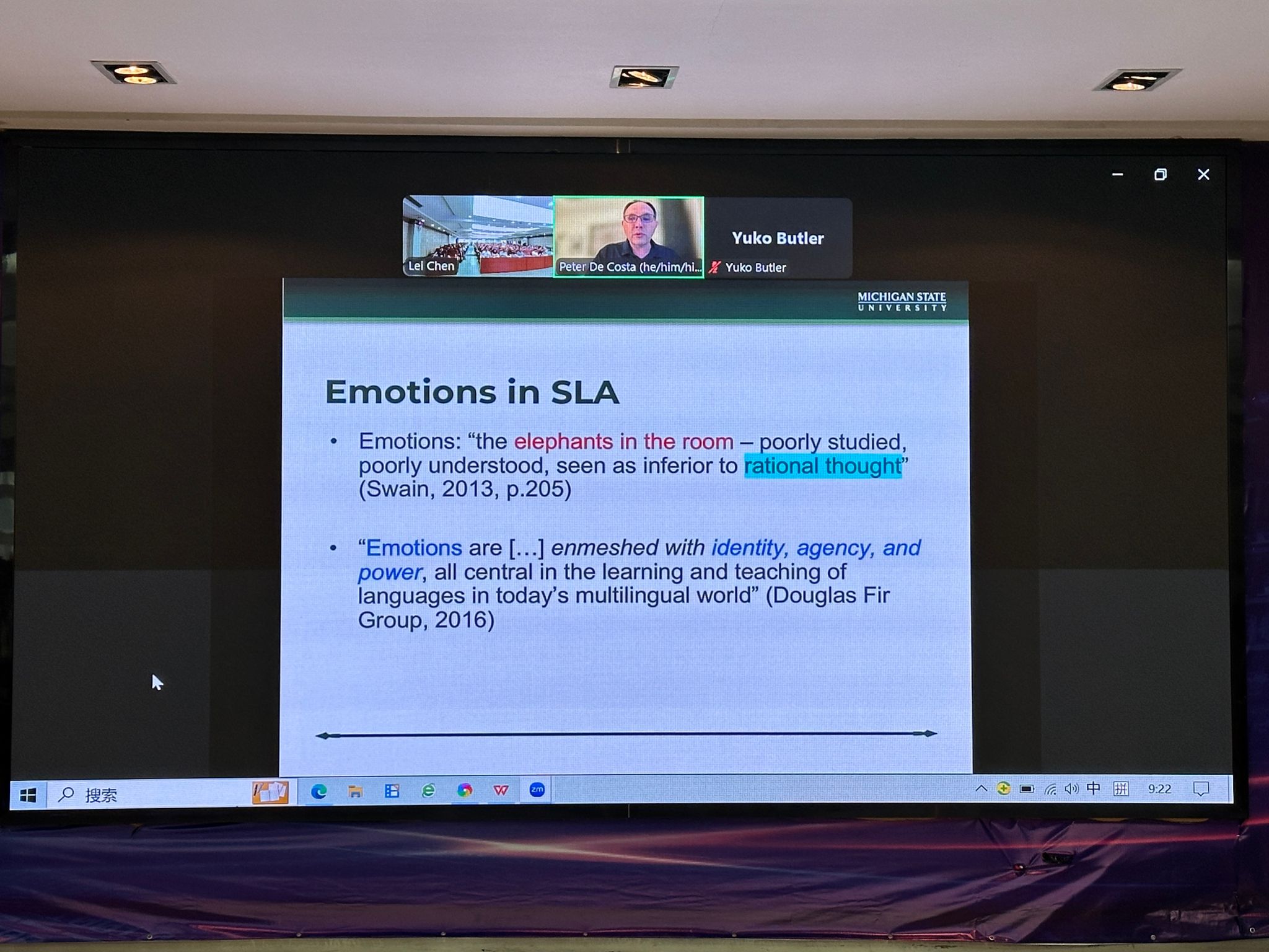 美国密歇根州立大学Peter De Costa教授以The Emotional Turn in Second Language Teacher Education为题进行报告,阐释了其对二语教学过程中教师的情感转向机制所进行的相关研究。