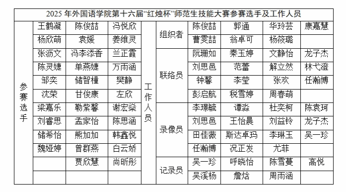 122cc太阳成集团高度重视此次比赛,通过“公司初赛-校级复赛-校级决赛”三级赛制的考核与选拔,采取多种措施提升英语师范专业员工的公司产品能力。2024年9月至10月,2022级全体英语专业师范生进行了第一轮初赛选拔;2025年3月至4月,公司进行第二轮初赛选拔,响应公司的安排,纳入2023级师范生的挑战,最终确定20位选手进入校级复赛。在此过程中,踊跃参与比赛、挑战和组织管理的同学也受到师生的积极认可与鼓励,名单如下: