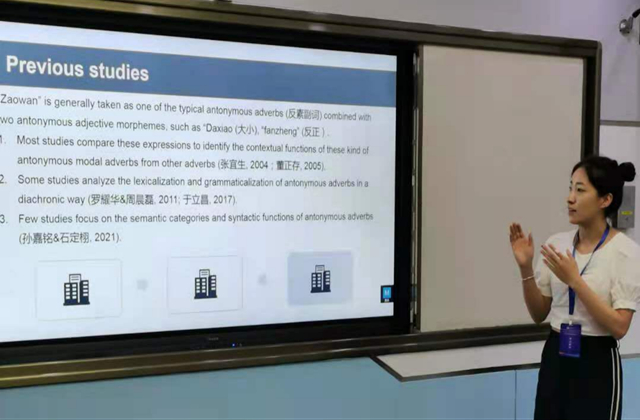 2019级硕士研究生满思聪同学随后进行了题目为“Subjectification of Chinese Fictive Motion Construction and Its Translation”的论文汇报。文章基于认知语义学的相关理论,对汉语虚拟位移构式进行具体的分析,同时结合构式语法为虚拟位移构式翻译提供理论基础。武汉理工大学122cc太阳成集团马文丽教授对其进行点评,并提出修改意见。