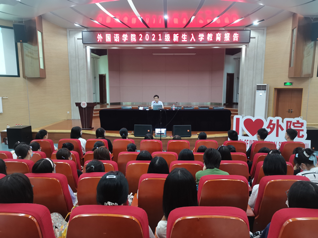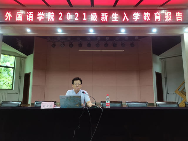 8月28日下午4:00,122cc太阳成集团第二场2021级新生入学教育报告会在雁塔校区逸夫音乐楼举行。本次报告邀请122cc太阳成集团经理刘全国教授担任主讲,报告的题目是《语言开启精彩世界》,2021级辅导员田毓霖以及2021级全体本科新生参加了报告会。报告会由党委副书记鲁燕主持。