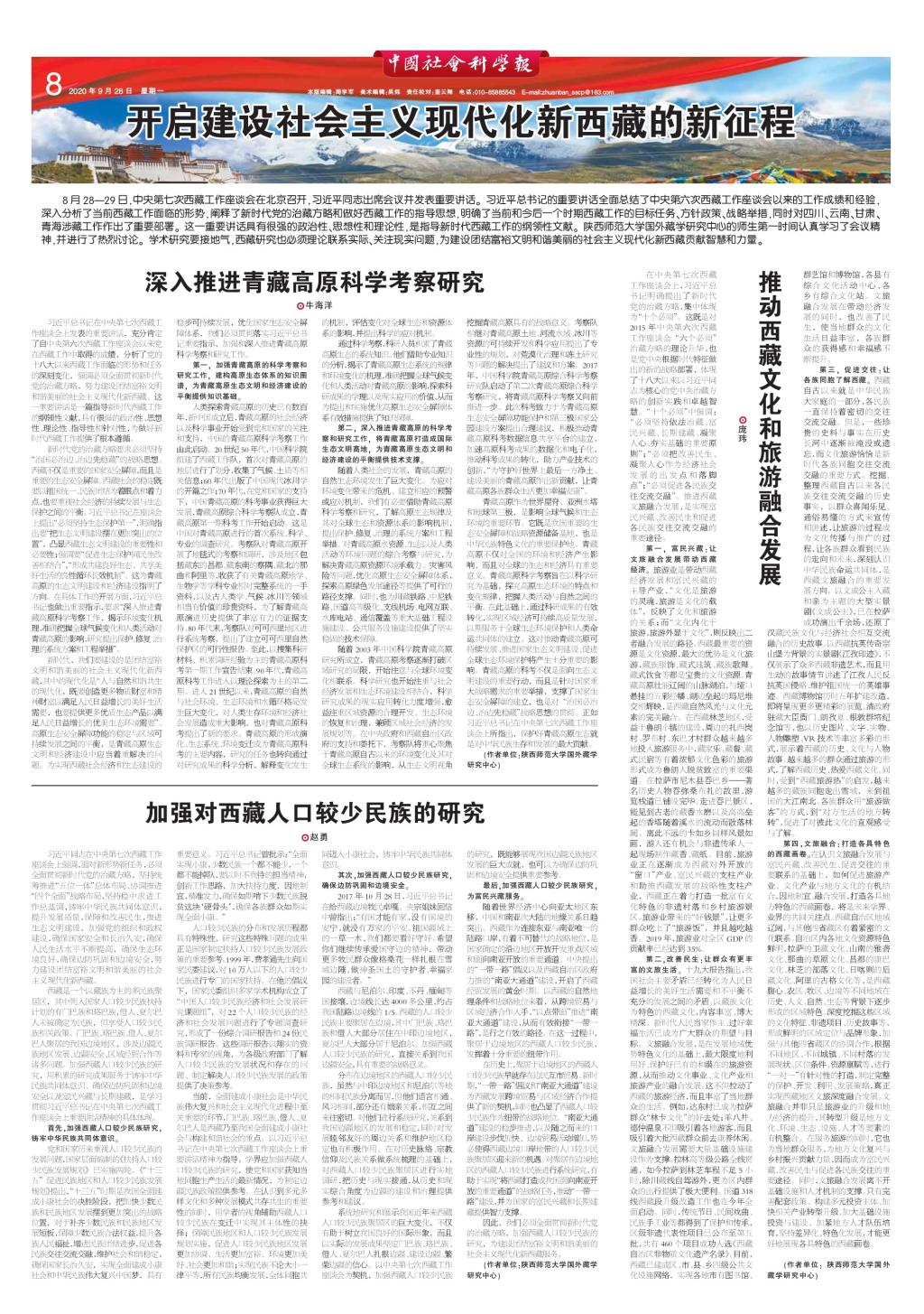 9月28日,《中国社会科学报》在第8版以“开启建设社会主义现代化新西藏的新征程”为主题,专版刊发了公司122cc太阳成集团王启龙教授团队成员的一组署名文章。该组文章共有三篇,依次为牛海洋老师发表的《深入推进青藏高原科学考察研究》、庞玮老师发表的《推动西藏文化和旅游融合发展》以及博士生赵勇同学发表的《加强对西藏人口较少民族的研究》。