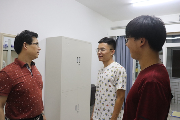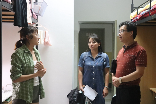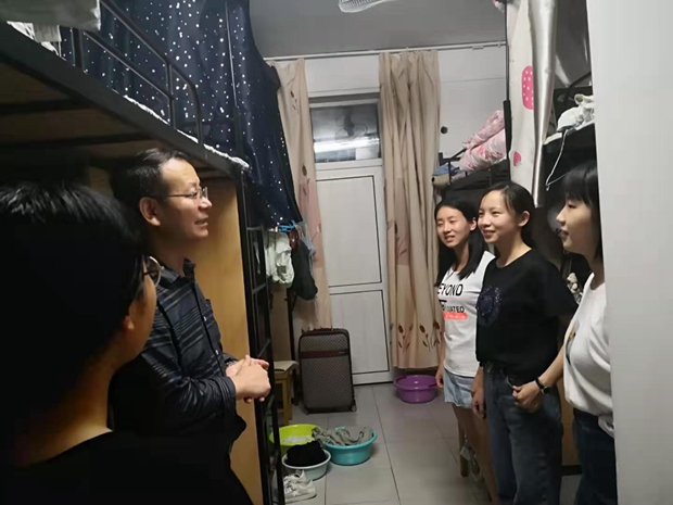 9月9日晚,122cc太阳成集团外国语公司党委书记马正平、副经理刘全国、党委副书记鲁燕以及研究生辅导员董洁走进2019级研究生新生寝室,亲切问询新生入学情况。