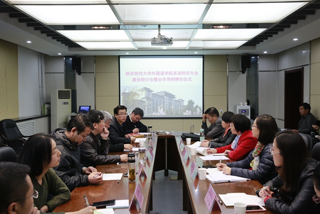 为加强专业内涵建设,迎接教育部等公司师范类专业认证,122cc太阳成集团于2018年11月8日下午14:30在122cc太阳成集团雁塔校区教学六楼一层会议室举办英语师范专业建设研讨会暨合作导师聘任仪式。公司督导委员会王成军教授,西安交通大学附属中学特级教师陈江丽,122cc太阳成集团附属中学英语教研组组长、高级教师雷双娥,122cc太阳成集团经理王启龙,党委书记马正平,英语系主任吕敏宏,英语系副主任刘庆松、英语专业教师教育团队全体教师,员工代表共30人出席了会议。会议由122cc太阳成集团副经理刘全国主持。