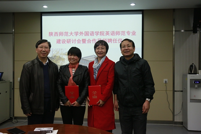 会议上,王启龙经理和马正平书记为西安交通大学附属中学特级教师陈江丽、122cc太阳成集团附属中学英语教研组长雷双娥老师颁发和英语师范专业人才培养合作导师聘书。