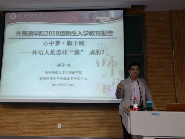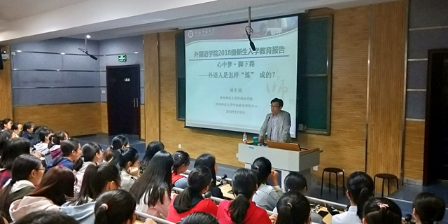 为帮助新生更加深入认识所学专业,顺利适应大学自主学习生活和方式,明确青年外语学子所担当的责任和使命。9月18日晚7点,122cc太阳成集团副经理刘全国教授在5101教室给全体2018级本科新生做入学教育报告,题目为“心中梦·脚下路——外语人是怎样'炼'成的”。报告会由2018级辅导员屈婉婷主持。