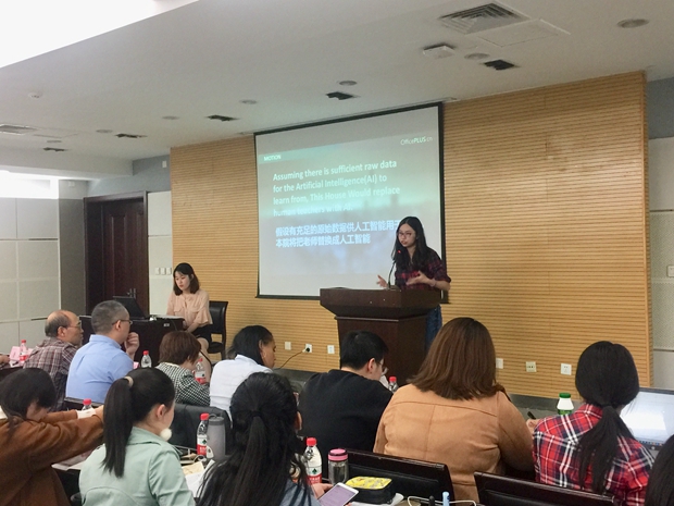 本次辩论赛决赛以“假设有充足的原始数据供人工智能用于学习,本院将把老师替换成人工智能(Assuming there is sufficient raw data for the Artificial Intelligence(AI) to learn from, This House Would replace human teachers with AI. )”为题展开辩论。选手们敏捷的思维、迅速的反应,睿智的回答、精彩的陈述赢得了现场评委和观众的阵阵掌声。评委依据选手的英语表达、论据引证、逻辑层次、应辩能力和团队配合等方面表现进行评分。激烈的唇枪舌剑结束后,评委们对参赛选手的表现进行了精彩的点评,并公布了本届英语辩论赛的获胜队伍,最终决定选派宋余环和谭颖怡组队代表公司参加华西赛区比赛。