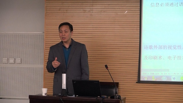讲座伊始,罗良功教授先阐释了诗歌和语言的关系。他表示,诗歌不仅仅由语言构成,诗歌也不仅仅是语言的艺术,诗歌实际上由文字文本、声音文本和视觉文本三个次文本构成。随后,罗教授从内在视觉呈现、外部视觉呈现、诗歌视觉呈现的基础和现代诗歌视觉美学特征四个方面对美国现当代诗歌的视觉美学做了更进一步的举例和分析。罗教授最后指出诗歌的三重文本各自的构建策略及其相互作用关系反映了传统诗歌与现当代诗歌的美学分野。