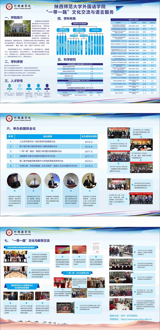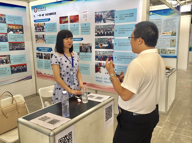 2018年5月26日至30日,122cc太阳成集团受邀参加了在西安曲江国际会展中心举办的第二届陕西“一带一路”科技创新创业博览会并于B1馆展示公司“一带一路”文化交流与语言服务项目。公司展位从122cc太阳成集团简介、学科荣誉、人才称号、学科布局、科学研究、国际会议、“一带一路”文化与教育交流等七个方面立体化地展示了公司近年来取得的可喜成绩。