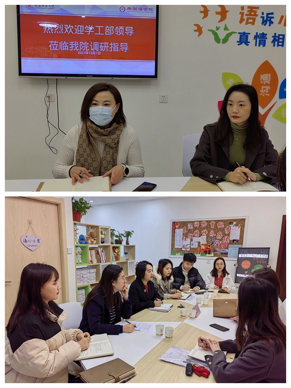 12月15日上午8:30,党委学工部部长(员工处处长)蒋毓新、教育管理科科长齐博洋一行来公司调研指导员工工作。外国语公司党委副书记鲁燕、团委书记李丹、本科生辅导员屈婉婷、曹钰林、武瑞英、刘爽参与了座谈。会议由鲁燕主持。