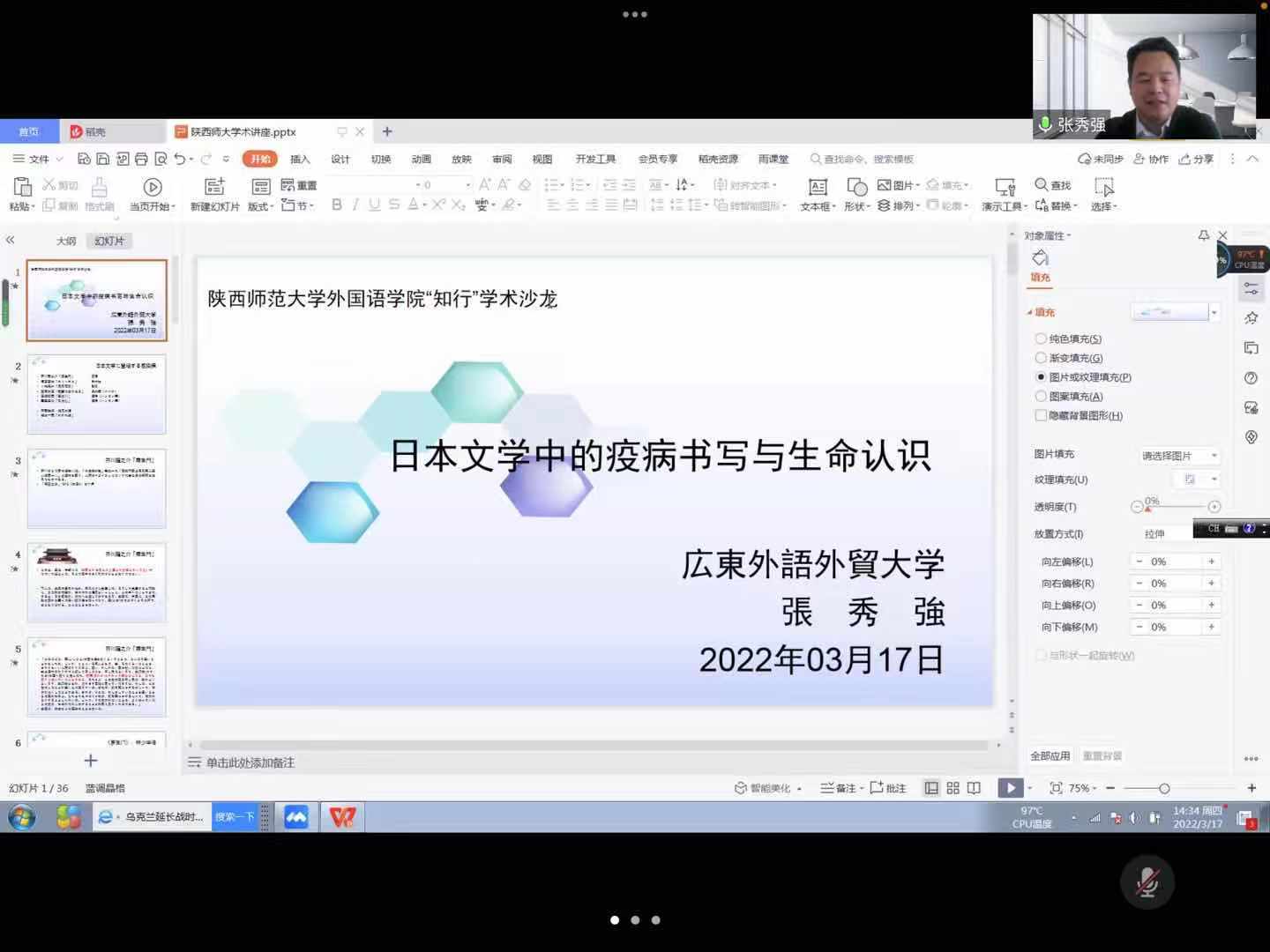 2022年3月17日下午,122cc太阳成集团“知行”系列学术沙龙“日本文学中的疫病书写与生命认识”在腾讯会议上举办。本次沙龙由东北亚与欧洲研究学科团队主办,广东外语外贸大学张秀强教授主讲,公司曹婷副经理主持,122cc太阳成集团日语系及校外师生近40人参加。