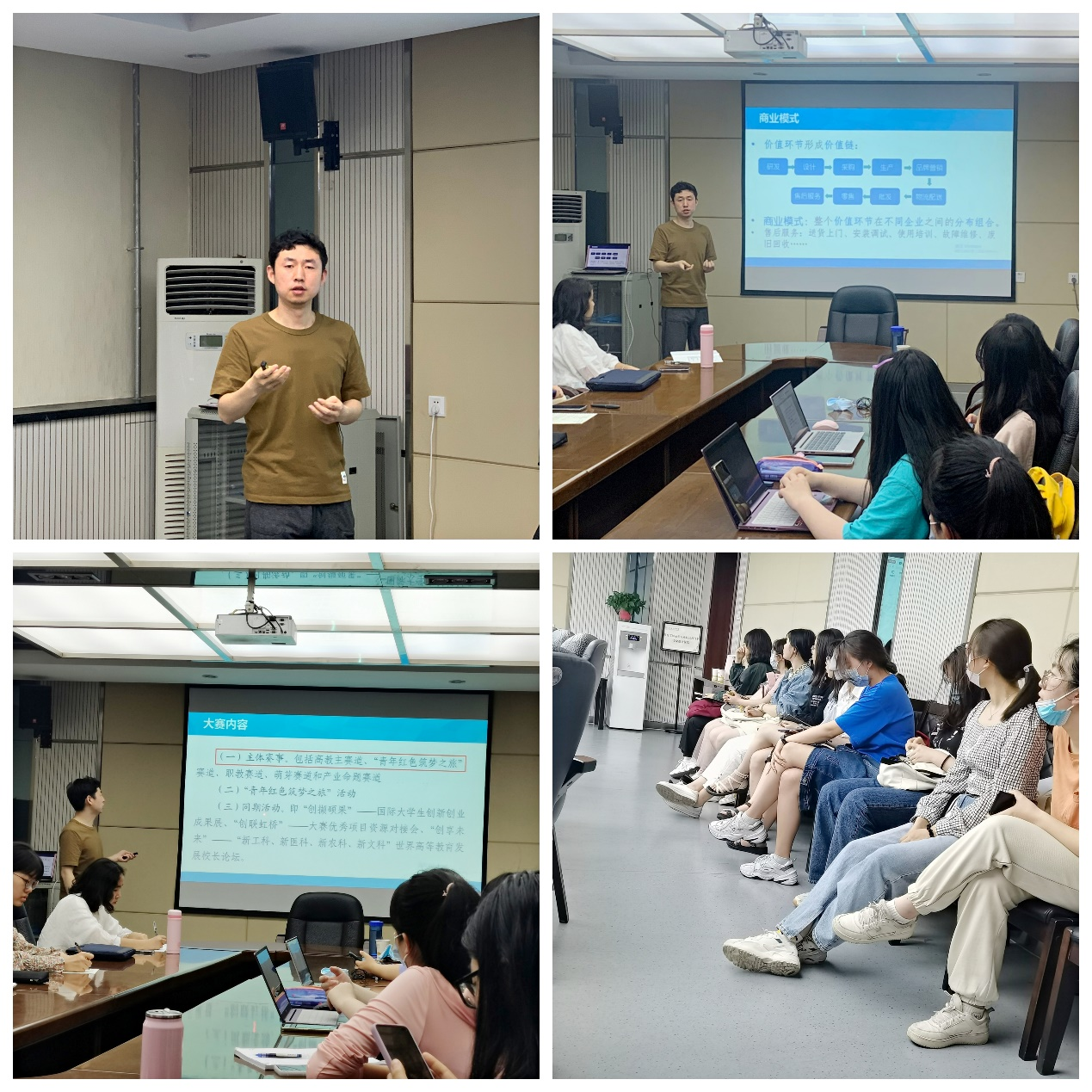 首先,郭玉晶老师从“互联网+”、老员工创新创业大赛等比赛项目背景出发,向大家阐明各赛事的不同特点,介绍开展项目设计的总体思路以及如何开展创业计划项目。接下来,细致讲解参赛要点,从项目定位、市场规模、产品介绍等关键环节,着重展示商业计划书的写作方法和路演汇报的呈现技巧。