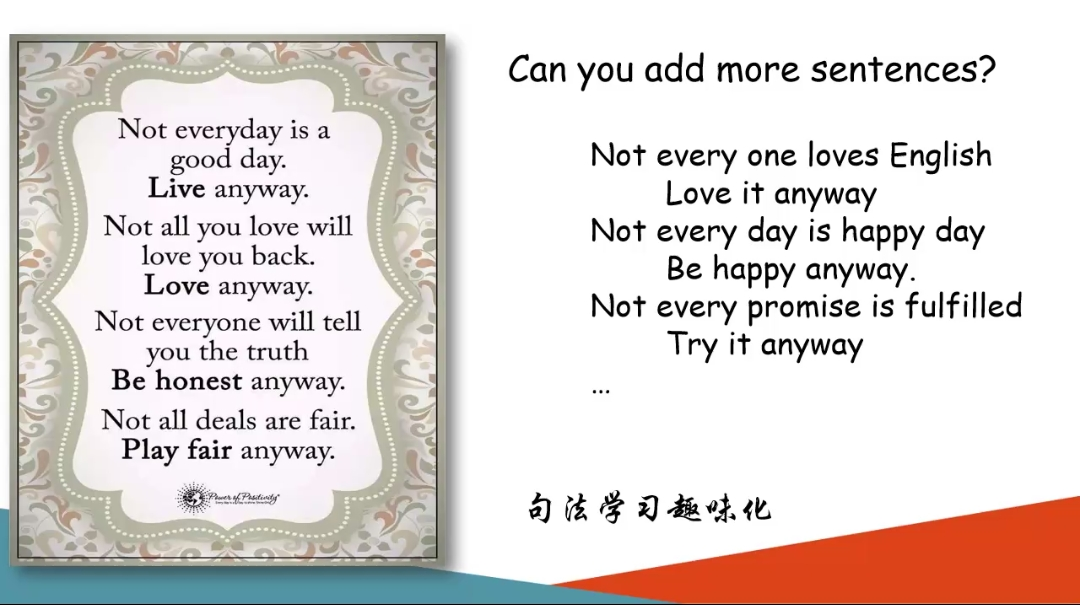 在同学们对课堂教学模式和课后练习部分有了充分了解之后,李革菊老师展示了英语教学中的一些经典实例,并与同学们一起展开具体分析,使同学们深刻了解了语法教学及句法学习的一些变化趋势及其特点,如语法教学的趣味化、生活化、系统化,并向我们展示了教师及员工对习题不同的改编,反映出了教学法在实际教学当中的不同应用及实际效果。