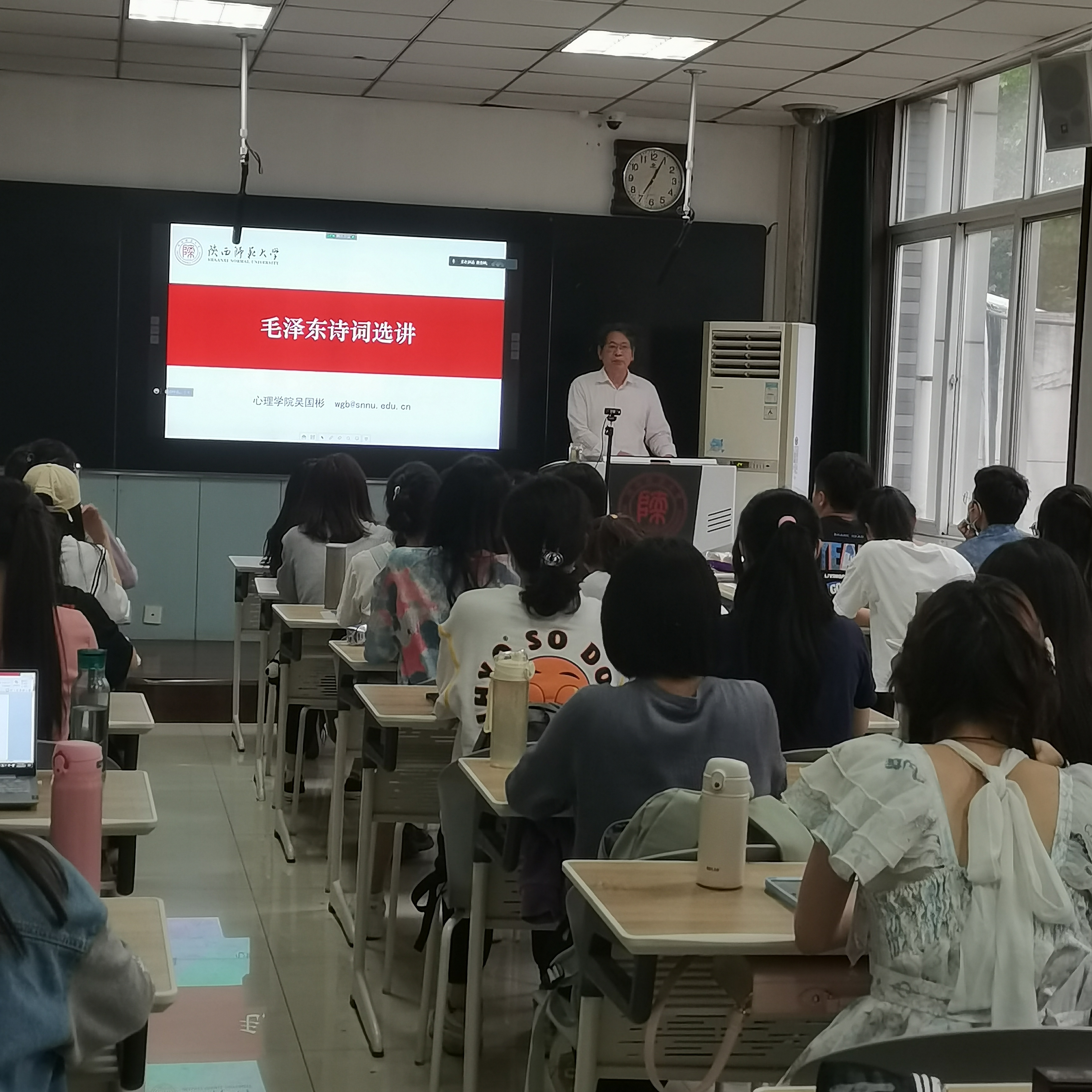 5月17日,在题为《毛泽东诗词选讲》的专题报告上,心理公司党委书记吴国彬老师通过为同学讲述伟大领袖毛泽东同志在人生的不同阶段创作的三首诗词,带领同学们领略毛主席诗词中传递的坚定的革命情怀和昂扬的革命斗志,激励同学们胸怀坚定信念,结合家国情怀,实现伟大抱负。