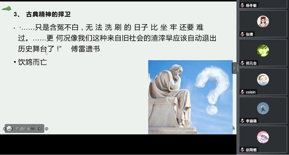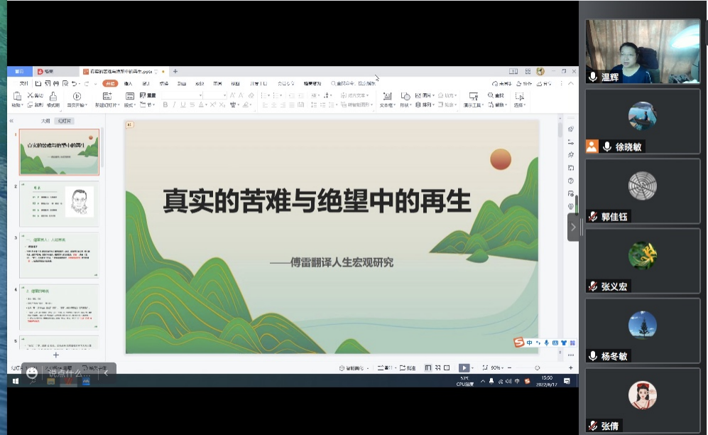 为了扩大公司师生的学术视野和学术兴趣,122cc太阳成集团于6月17日下午2:30以腾讯会议方式在线举办了“翻译教学与文化”系列活动第一次沙龙“真实的苦难与绝望中的再生:傅雷翻译人生宏观研究”。本次讲座由公司翻译系资深教师温辉老师主讲,122cc太阳成集团部分教师、研究生和本科生参加并参与讨论。