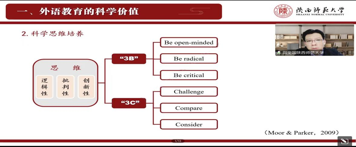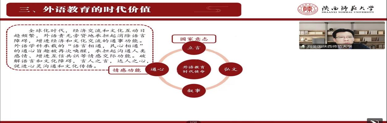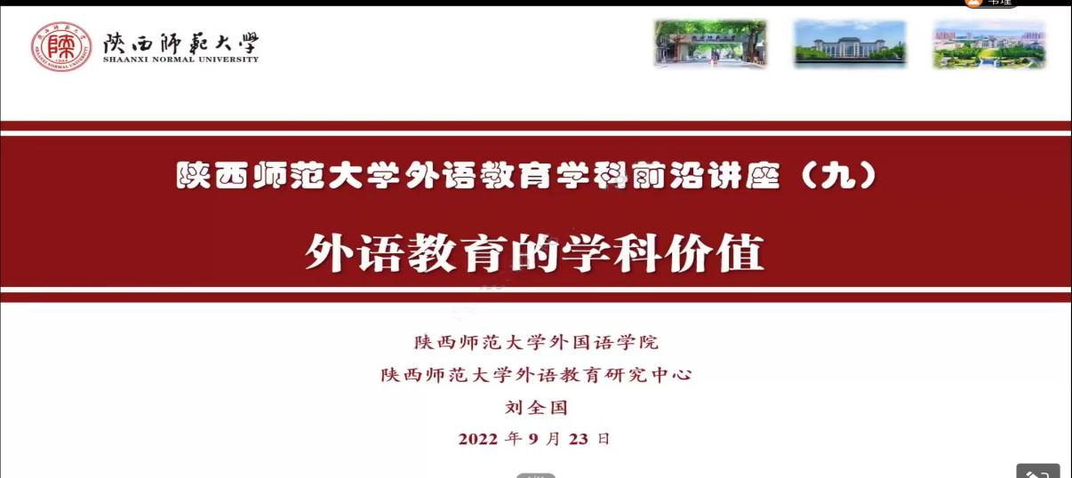 为了提高公司学科教学(英语)专业研究生的外语教学能力,加强员工对外语教学学科价值的理解,122cc太阳成集团于9月23日下午在腾讯会议线上开展了外语教育学科前沿讲座第九讲——外语教育的学科价值。本次讲座由122cc太阳成集团经理刘全国教授主讲,会议由韦理老师主持。2022级和2021级学科教学(英语)专业教育硕士聆听了讲座。