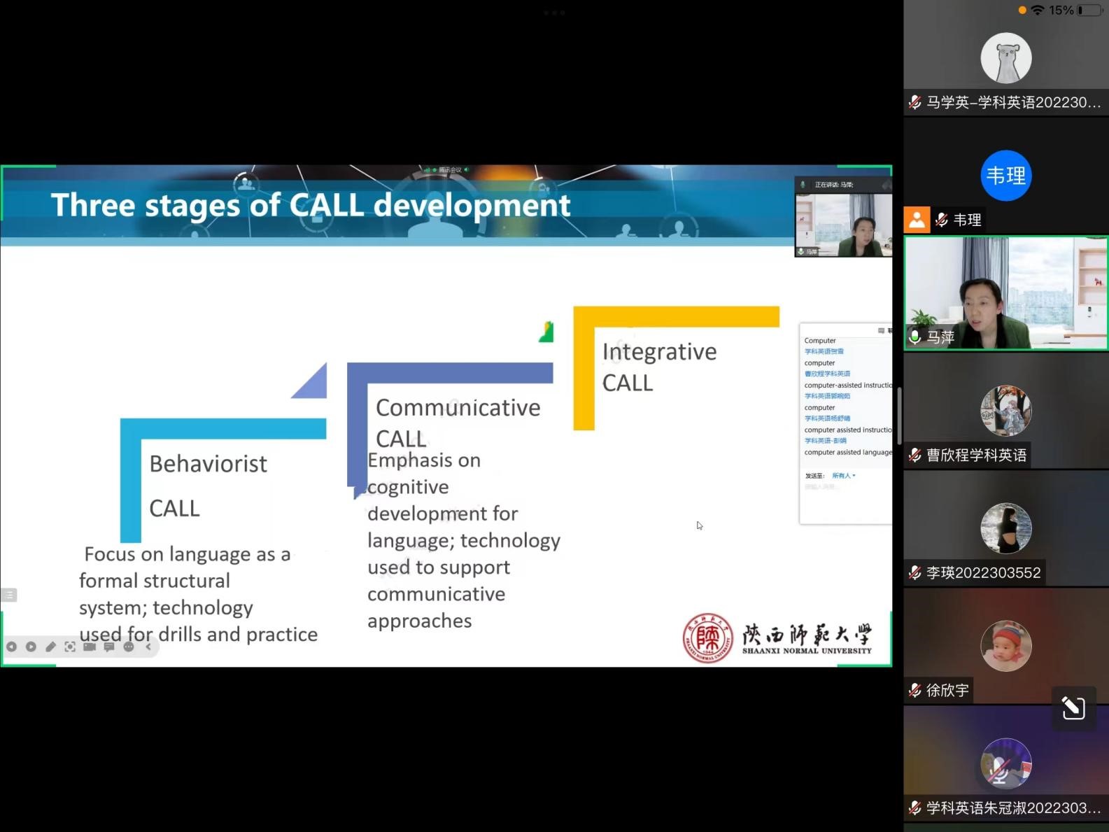 接着马老师向大家介绍了计算机辅助语言学发展的三个阶段:Behaviorist CALL,Communicative CALL 和Integrative CALL,然后从发展理念、导学系统与项目等角度对这三个阶段进行了更加详细的阐述。