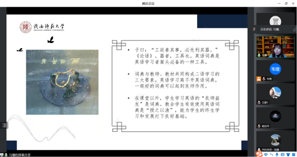 首先马老师通过引入日常生活中词典的使用,强调了词典的重要性。她指出作为教师,我们应该教会员工意识到词典工具的重要性以及教会员工使用词典这一重要的工具。接着马老师对于词典与外语教学的对接面进行了学理归因。