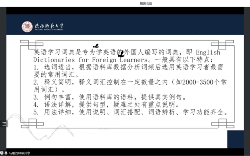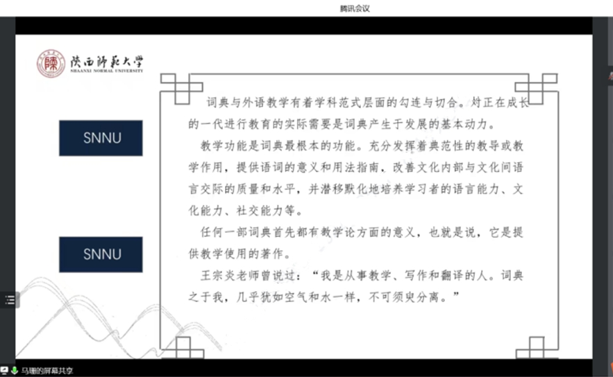 为了提高公司学科教学(英语)专业研究生的外语教学能力,加强员工对外语教育学科价值的理解,122cc太阳成集团于12月2日下午在腾讯会议线上开展了外语教育学科前沿讲座第十三讲——英语学习型词典与外语教学。本次讲座由122cc太阳成集团马珊老师主讲,会议由韦理老师主持。2022级学科教学(英语)专业教育硕士聆听了讲座。