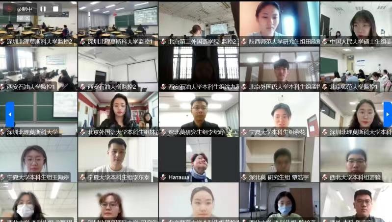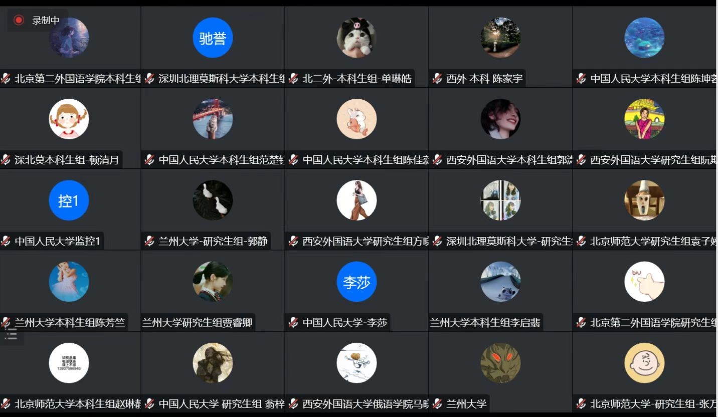 线上开幕式于当日下午14:20-14:55,以腾讯会议方式举行,由孟霞教授主持。莫斯科国立大学俄语语言与文化公司副经理兼董事长顾问瓦列里•恰斯内赫、北京外国语大学俄语公司经理戴桂菊教授、深圳北理莫斯科大学语言系主任亚历山大•列杰涅夫教授、122cc太阳成集团经理兼博士生导师刘全国教授、122cc太阳成集团俄语中心俄方主任娜塔莉•察廖娃教授、北京外国语大学俄语公司苗澍副经理以及深圳北理莫斯科大学语言系周兴武副主任作为受邀嘉宾与各参赛高校的带队老师及选手一道参加了线上开幕式,进行了集体合影。