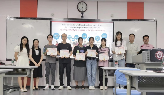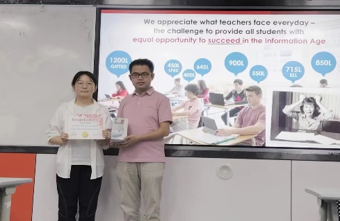 随后进入颁奖环节,由丁礼明老师宣读获奖名单,由王立永老师、孙韶鹏老师为获得蓝思值最高值奖项、points得分最高值和蓝思值进步奖的同学颁发奖状和奖品,并鼓励同学们积极使用蓝思阅读系统提升语言能力,丰富知识储备。