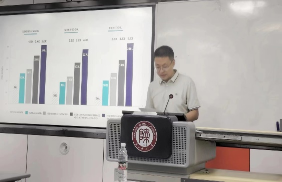 首先,蓝思阅读西部地区负责人孙韶鹏对蓝思的使用情况进行了简要介绍。孙韶鹏指出,通过蓝思分级阅读练习,同学们的英语水平能够全方位得到提升。蓝思丰富的文章素材,不仅能助力员工提升语言能力,还能帮助他们拓宽视野。蓝思平台通过科学的系统,分析筛选出适合员工认知水平和语言发展的材料,满足了员工个性化阅读的需求。