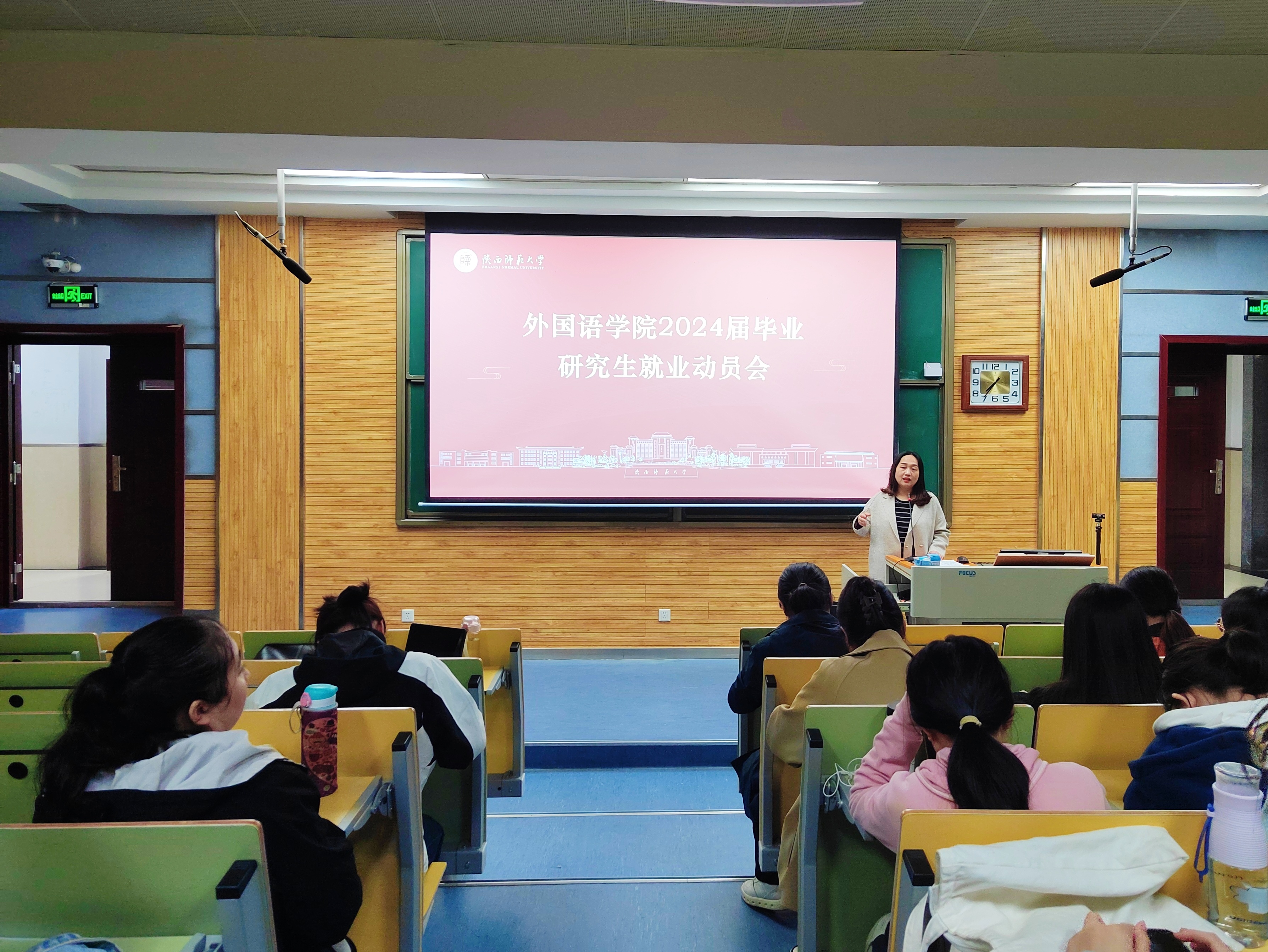 10月11日晚19:30,2024届毕业研究生就业动员会在雁塔校区教学五楼5101室举行。外国语公司党委副书记鲁燕出席会议,会议由研究生辅导员董洁主持,2024届毕业研究生140余人参加会议。