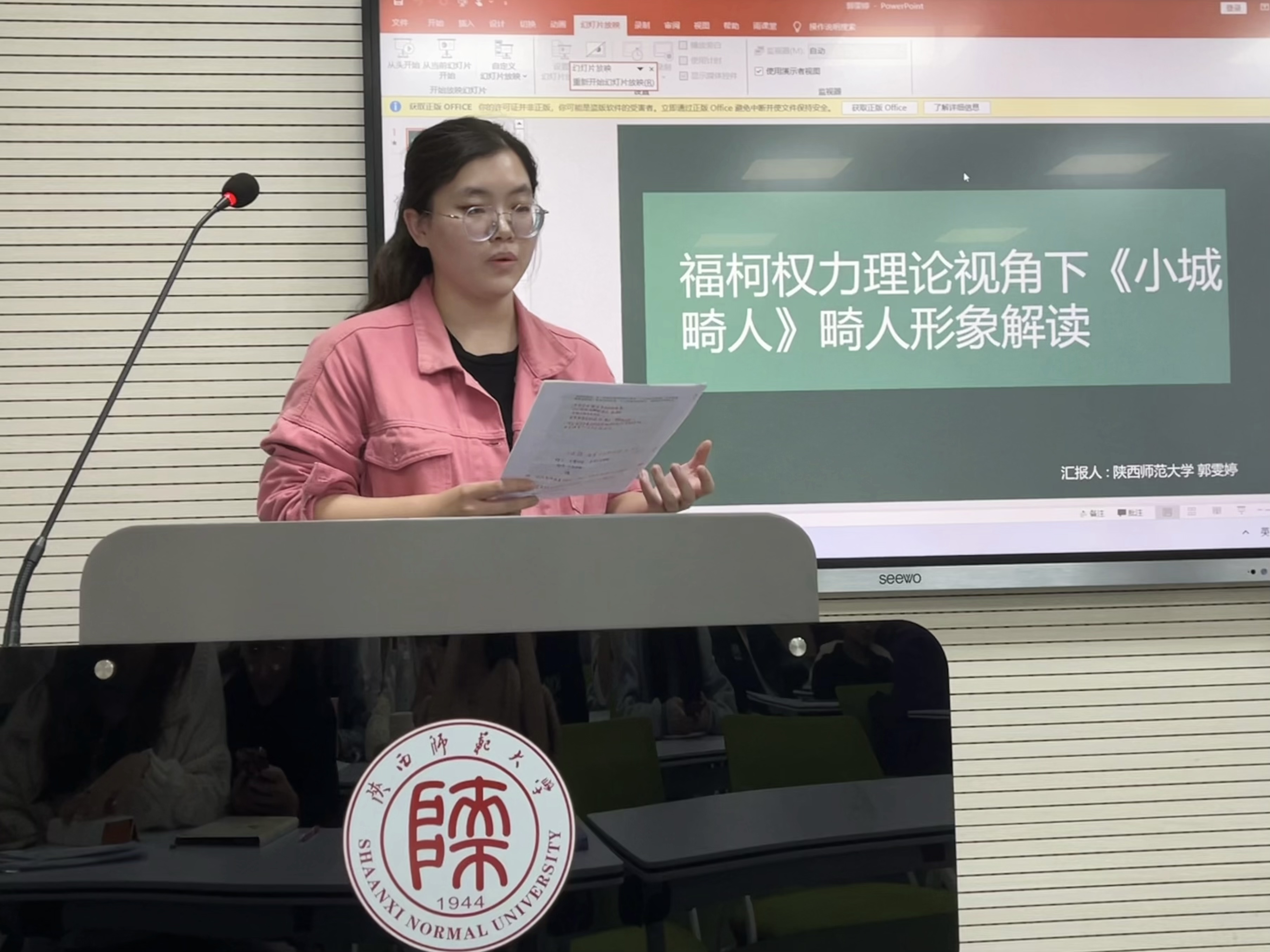郭雯婷以《福柯权力理论视角下〈小城畸人〉畸人形象解读》为题,从畸人的声音和话语、性与身体、形成原因以及结语四个方面进行了分析汇报。