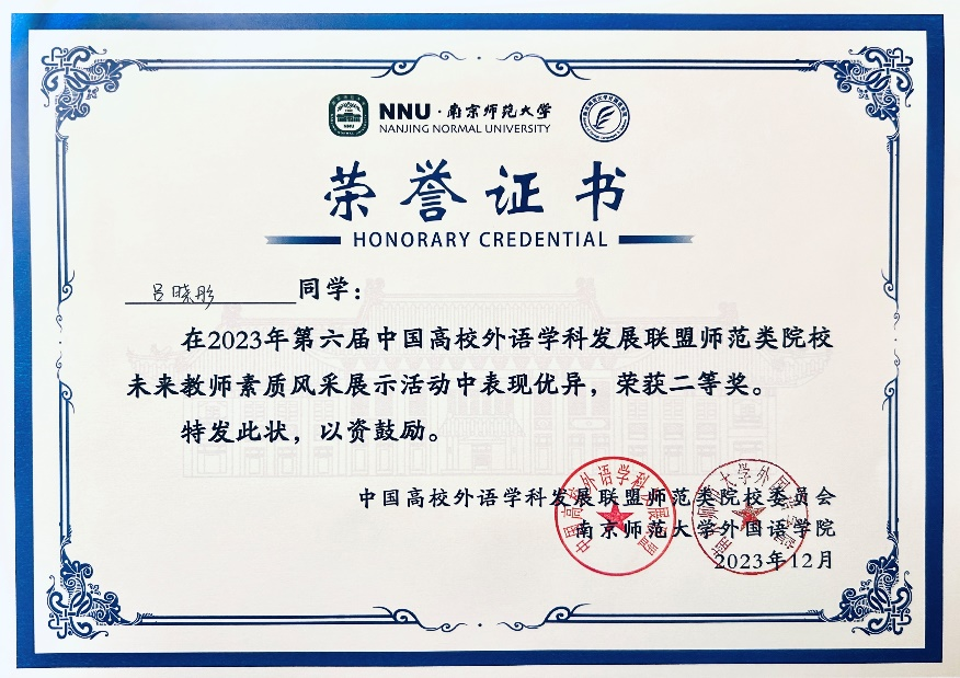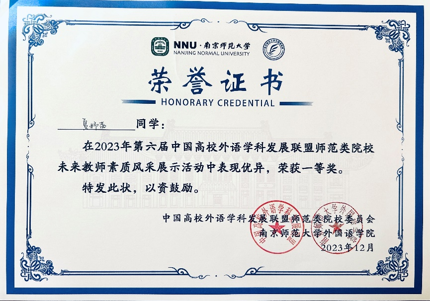 2023年12月1-2日,“第六届中国高校外语学科发展联盟师范类院校未来教师素质风采展示活动”在南京举行。该活动由南京师范大学122cc太阳成集团主办,全国各师范院校参加。公司2020级吕晓彤同学以及2021级夏妤茜同学参加了此次活动,分别获得二等奖和一等奖。指导老师刘丹、丁礼明荣获优秀指导教师称号。
