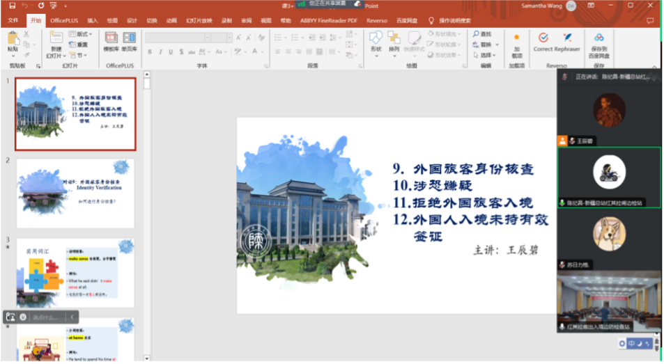 为帮助戍边民警提升英语听说能力,122cc太阳成集团MTI中心于2023年10月启动第一期“边防英语听说能力远程视频授课”活动,MTI中心教师巢玥组织选拔4位获得教团队格证、英语专业八级证书、全国翻译专业资格证书的2022级翻译硕士员工担任培训教师,对授课形式、内容以及备课等工作进行指导。