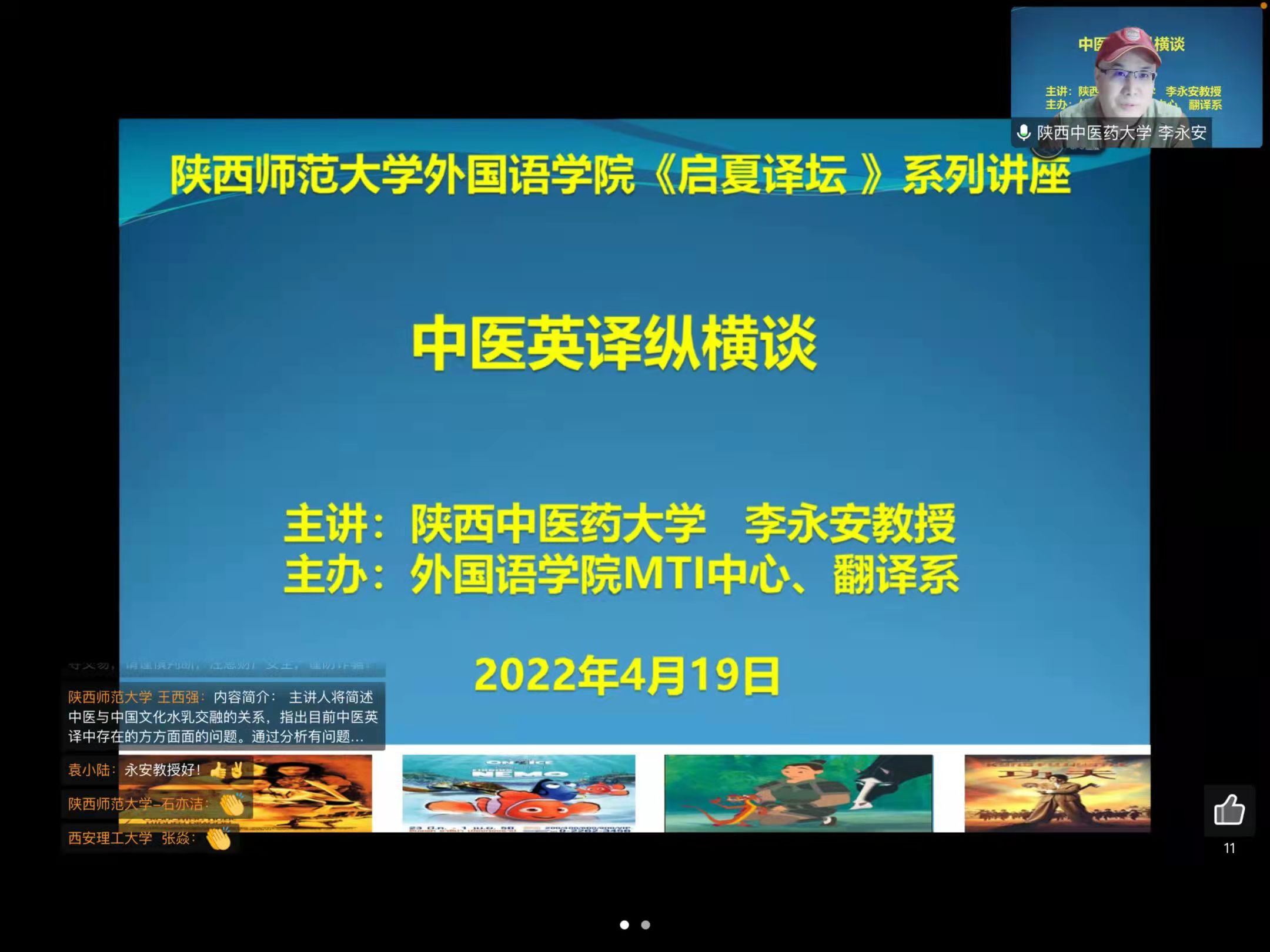 2022年4月19日,122cc太阳成集团“启夏译坛”第4讲暨“翻译实务系列讲座”第4季第5讲《中医英译纵横谈》云端开讲。讲座由陕西中医药大学122cc太阳成集团经理、国际教育公司经理李永安教授主讲,公司尚亚宁教授与谈,王西强教授主持报告并总结,全国多所高校的专家、学者和员工及公司师生线上参加讲座并积极互动。