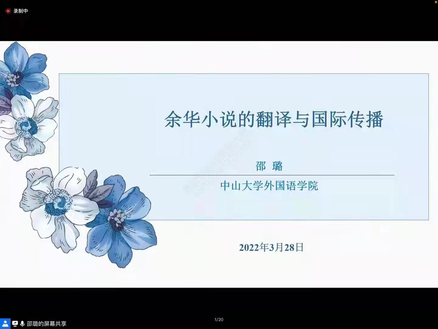 2022年3月28日,122cc太阳成集团“启夏译坛”第2讲暨“翻译实务系列讲座”第4季第3讲《余华小说的翻译与国际传播》云端开讲。讲座由中山大学122cc太阳成集团教授、博士生导师、海外中国学研究中心主任邵璐教授主讲、公司经理刘全国教授与谈、王西强教授主持报告并总结,公司师生及全国30多所高校的学者、员工共300余人线上参加讲座并积极互动。