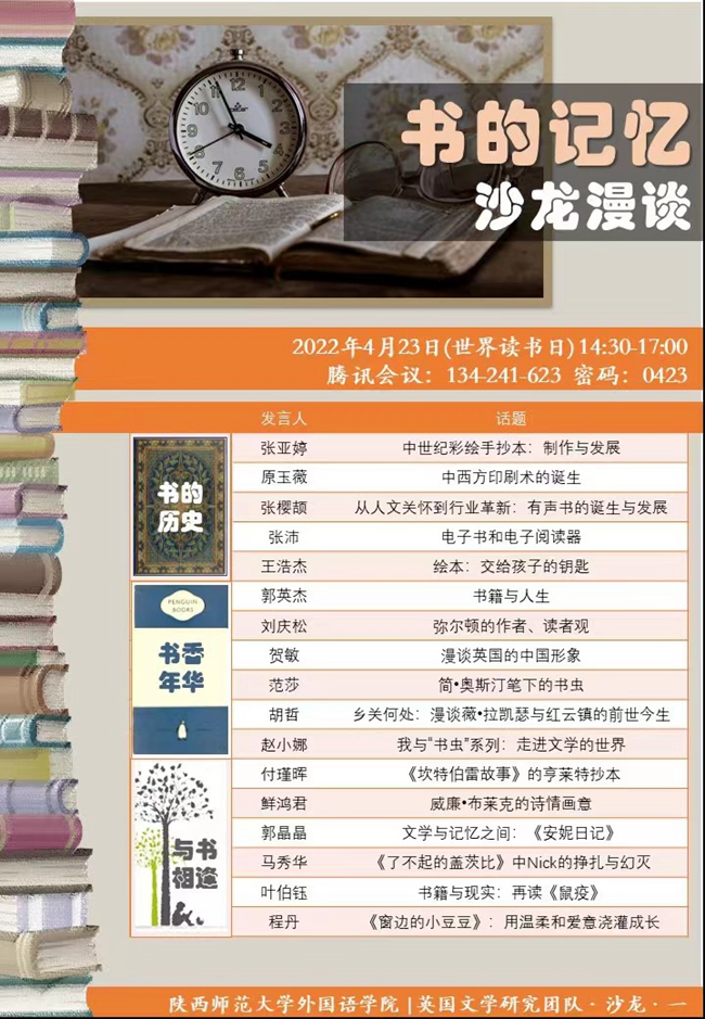 英国文学研究团队将于4月23日(世界读书日)举办第一场线上沙龙漫谈,主题为"书的记忆",浅谈书的发展史(从手抄本到印刷到电子书),讲述自己和书的故事,分享关于书籍的集体记忆或个人记忆。